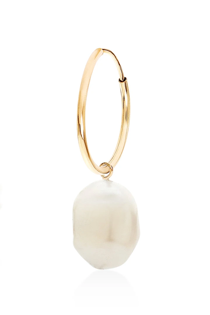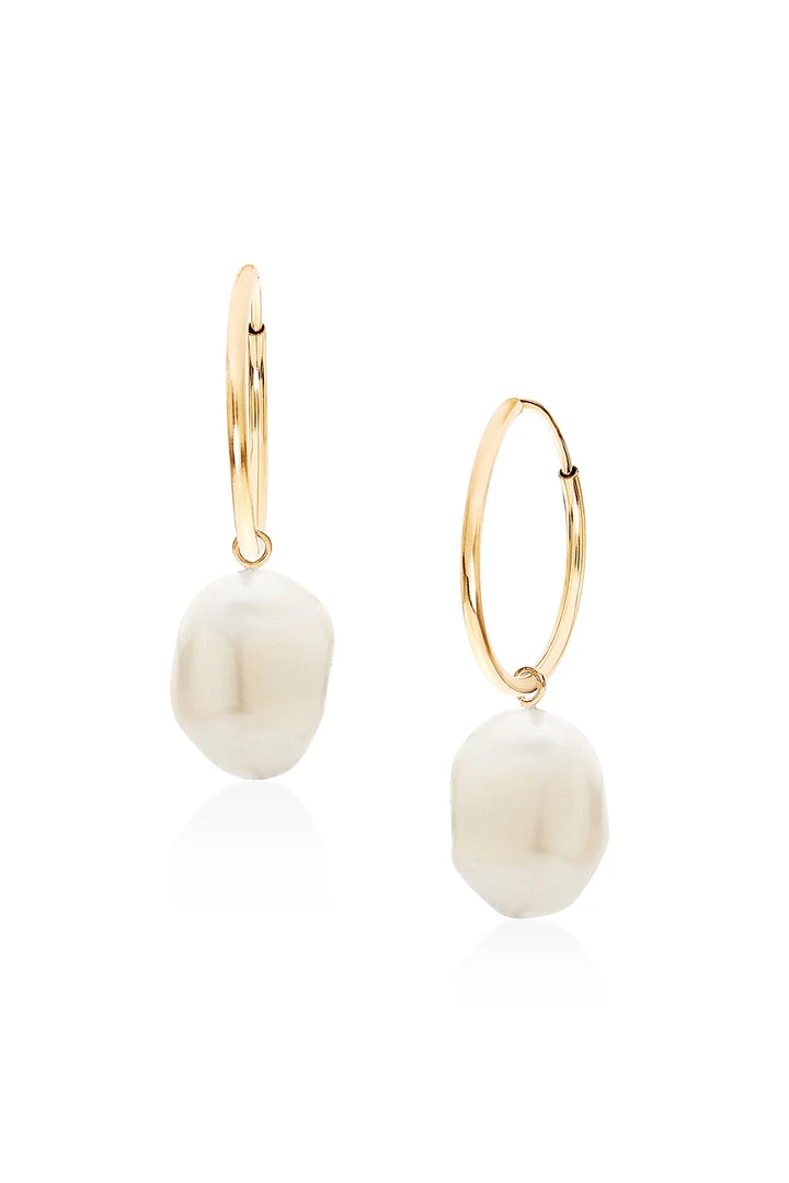 The big drop. Handcrafted in the big apple these feminine hoops feature a gold-fill loop with a freshwater pearl dangler that can easily be slipped off for a simpler look. Either way, itโs a versatile beauty.