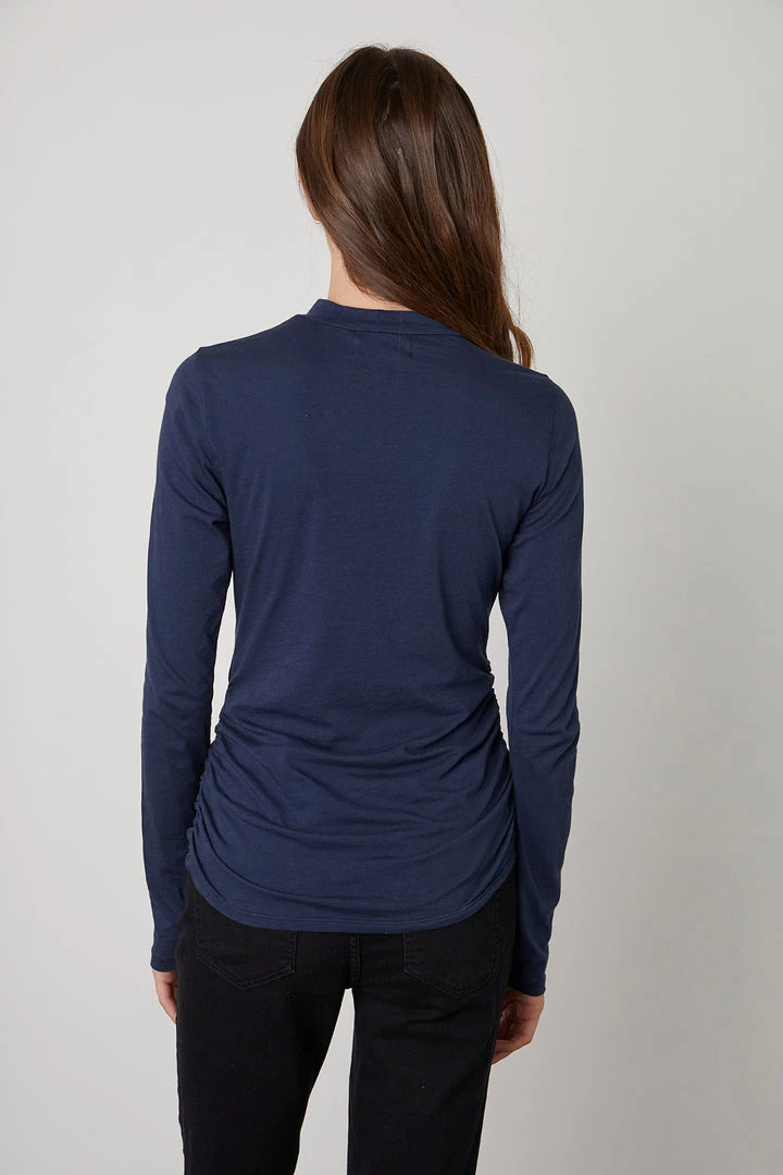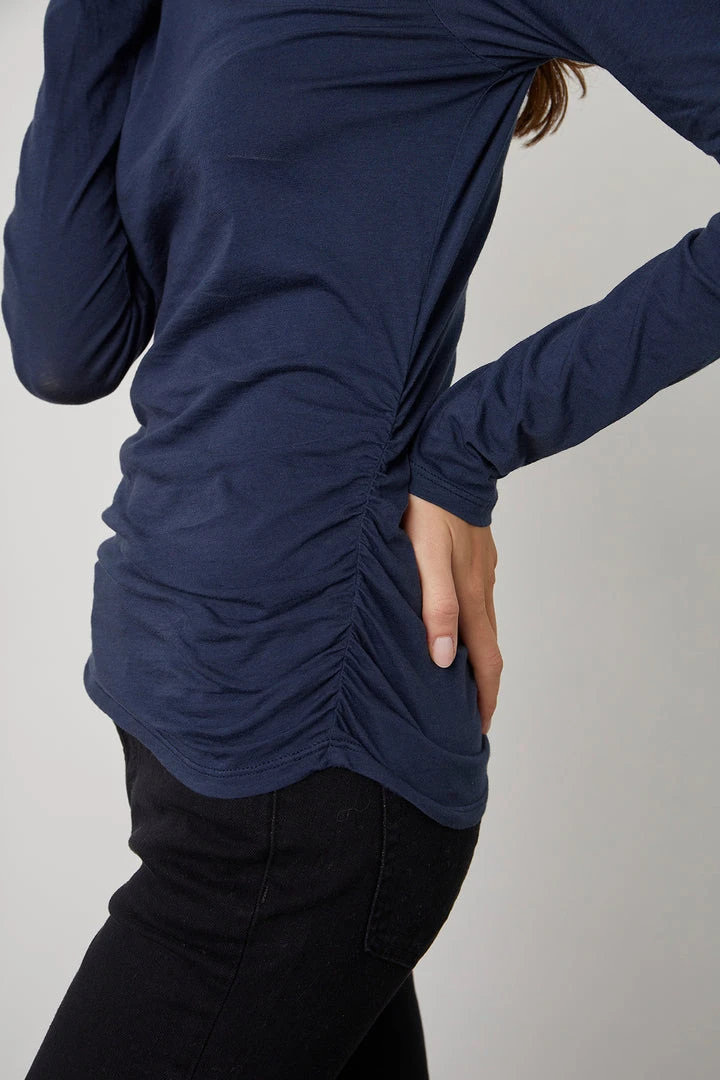 Our soft, whisper cotton is the perfect underpinning for fall. With shirred seams down either side, and slim fit with a slightly higher neckline, this top can easily be layered or worn solo.