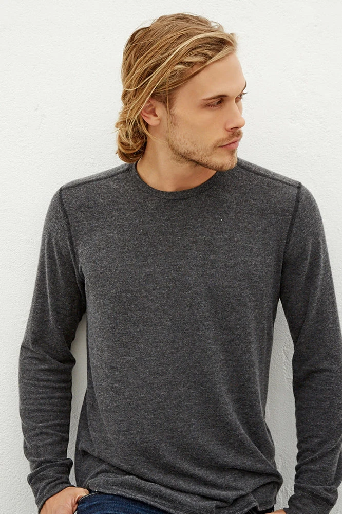 KEEP YOUR OFF-DUTY BASICS LOOKING STYLISH WITH THIS HEATHERED LONG SLEEVE KNIT TOP. THE FABRIC IS SUPER SOFT AGAINST THE SKIN AND THE BEST LAYERING WEIGHT. CHECK OUT THE ENGINEERED TUBULAR STITCHING ON THE SEAMS AND THE VISIBLE SEAM DOWN THE BACK.