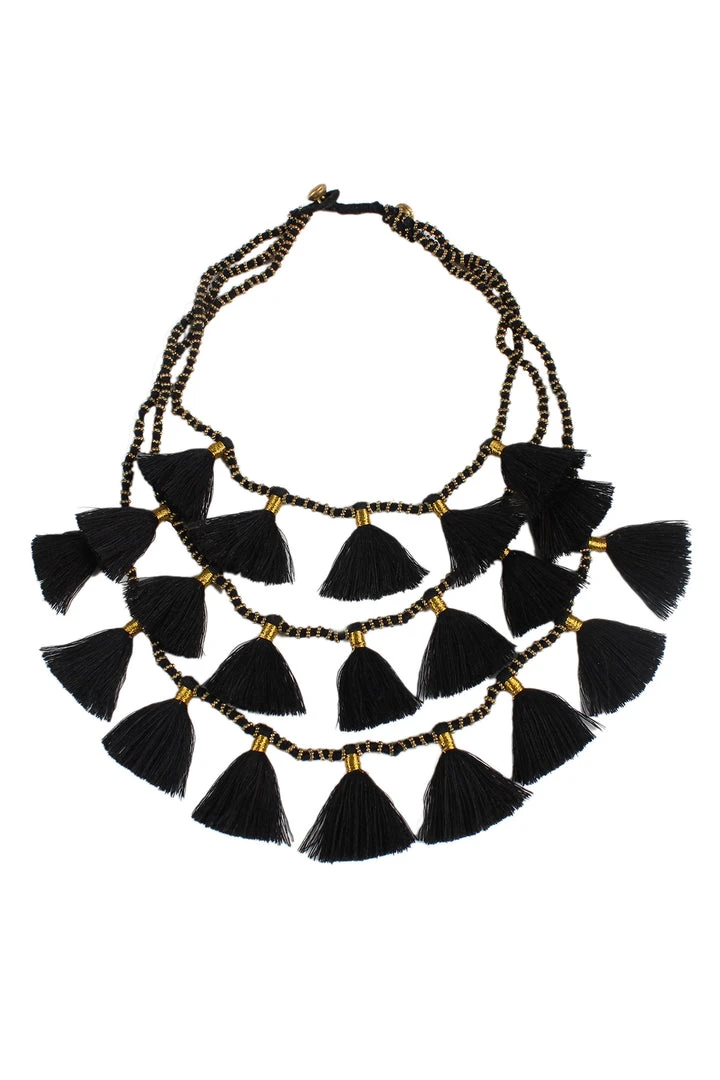 enhance your dรฉcolletage with this beauty. handcrafted in india and featuring three layers of thread tassels on a cord with tiny brass beads. there is a loop and bead closure at the back and you can adjust the length slightly depending on how you want to dress up your neckline. ย so pretty.
