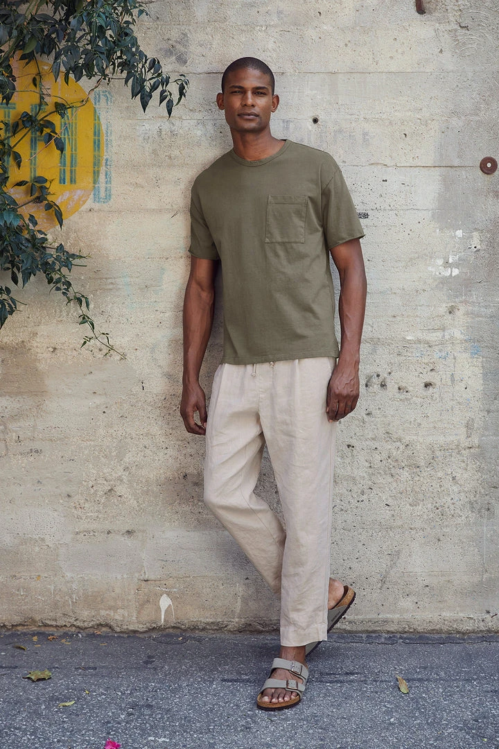 A very cool and casual trouser crafted from a woven linen. An elastic waist with a drawstring and a slightly tapered silhouette to the leg. Feel free to cuff.