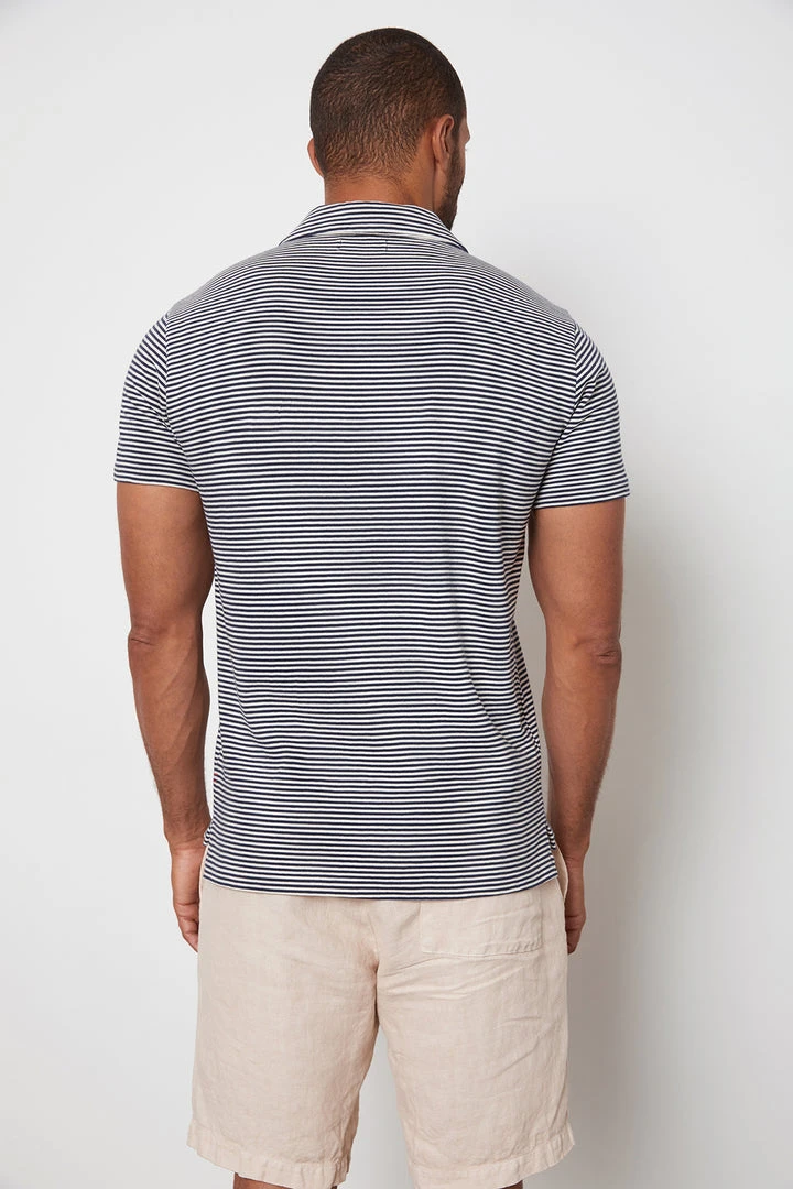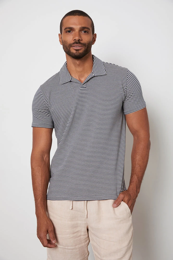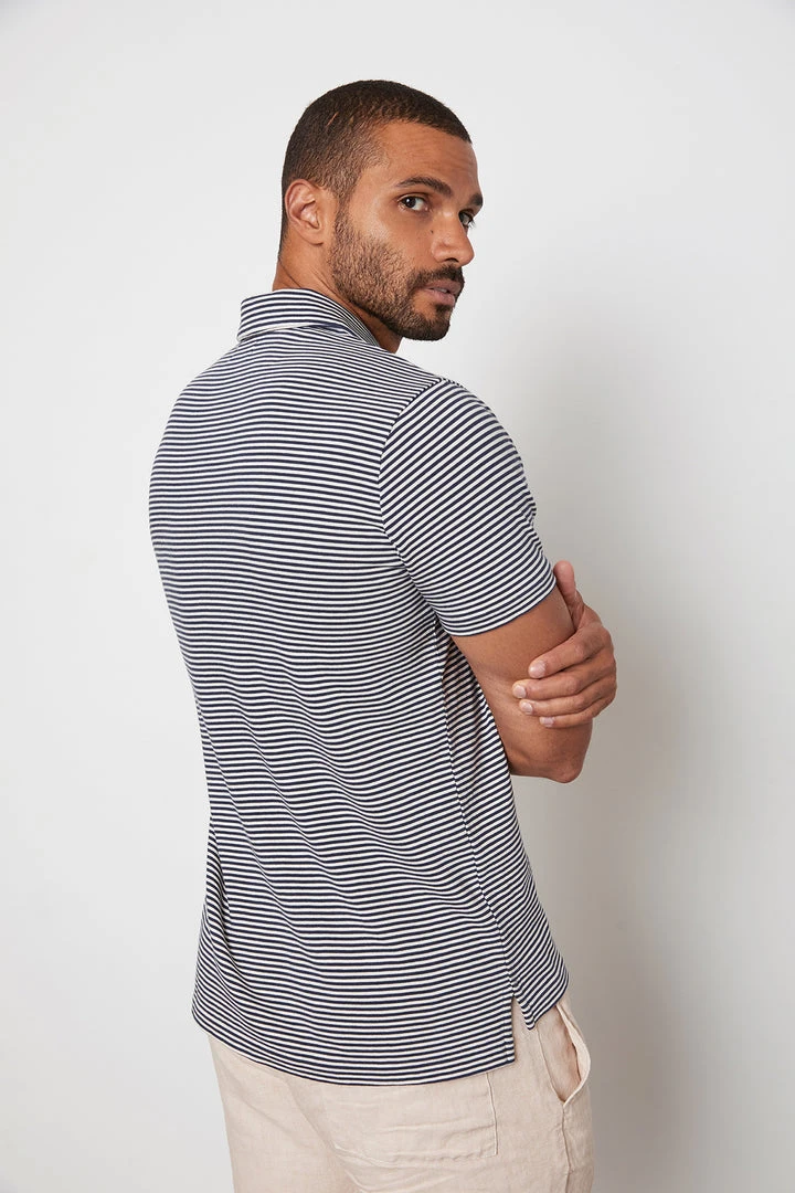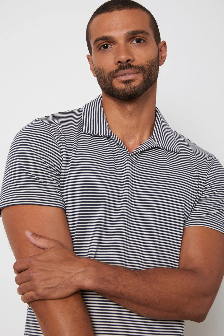 A crisp navy and white stripe signals the warm weather is here. Crafted from a soft jersey knit and with a buttonless placket give this polo a sleek, modern vibe along with the smaller-sized collar.
