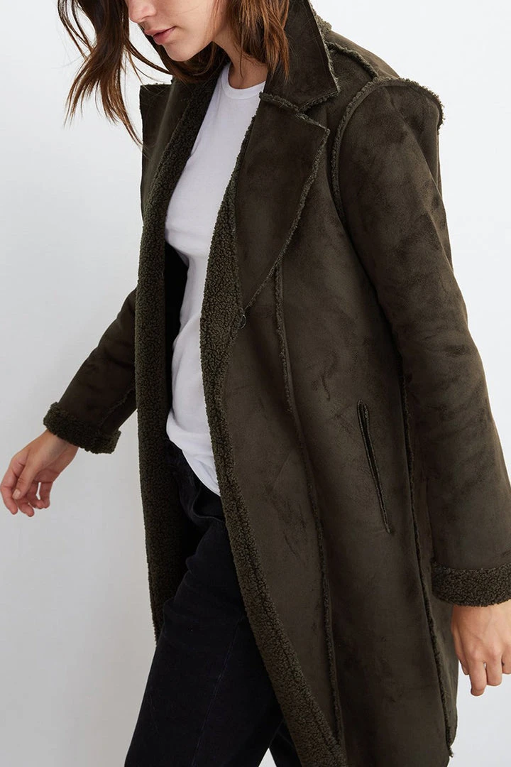 Here’s a fall beauty that’s twice as nice. This reversible coat features a eco-chic faux suede on one side or flip it for a cozy sherpa. Double popper buttons and slash pockets on both sides. So good.