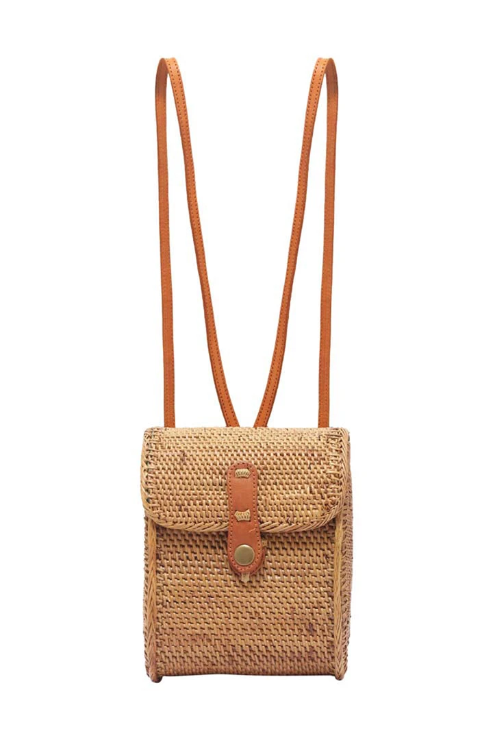 Crafted from a sturdy, natural Ata Palm leaf, this chic backpack features two long leather straps so the pouch sits lower on the back and a leather tab with a snap closure.