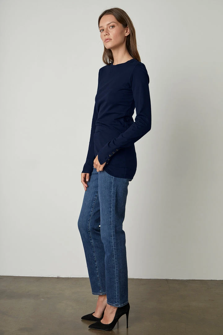 Have you tried our sueded jersey? It’s one of the softest knits around. With a slightly longer fit, it can be worn as a tunic and the 5-button cuff gives it a dressier edge if needed.