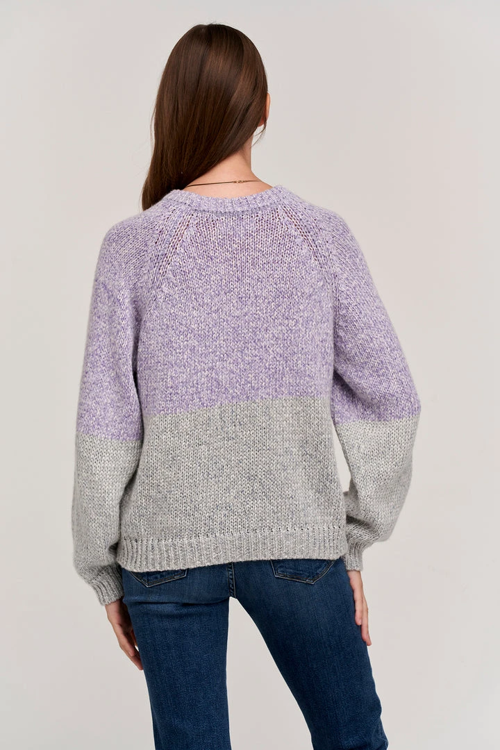 The transitional knit of the season. Crafted from a soft, yet substantial, Pima cotton, the lavender and gray color-blocking add a spring sentiment to the classic crewneck knit. Designed to be worn with a relaxed slouch.