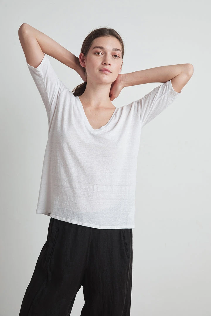 Fresh linen. Crafted from our signature linen knit that has a great heathered texture. This tee has been given a summer update with a v-neckline, half sleeves, and a relaxed silhouette.