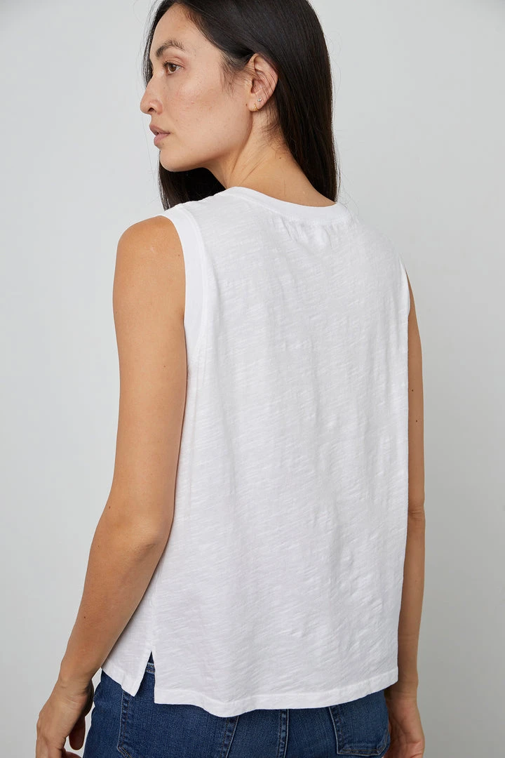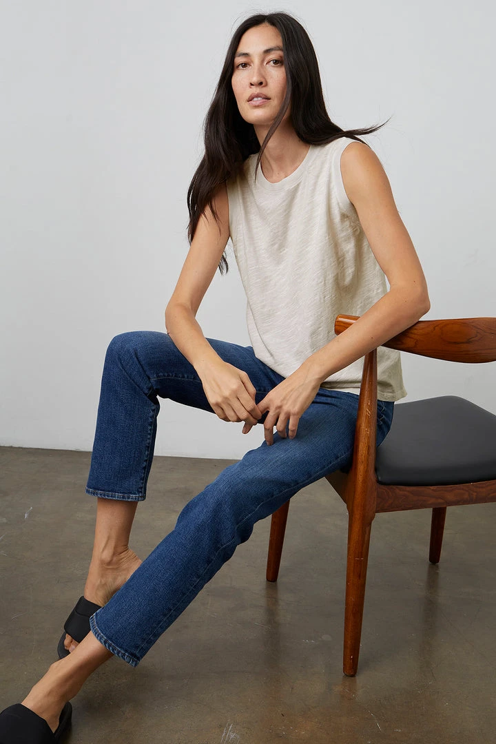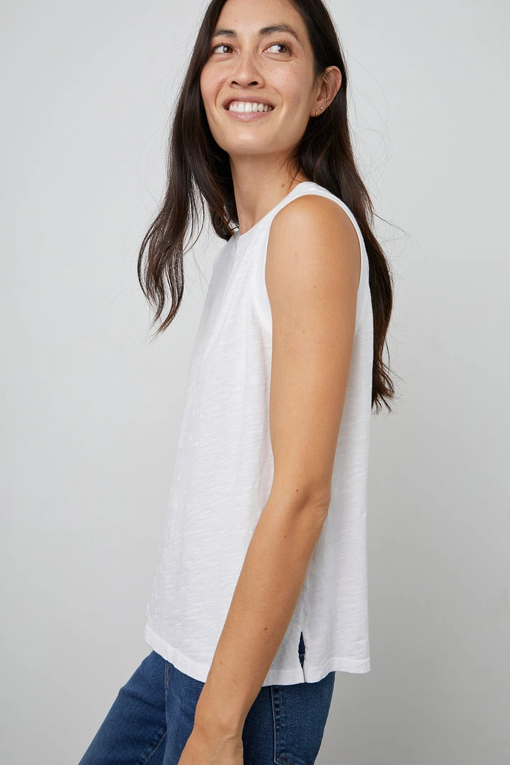 If youโve never tried our sleeveless tees you are in for a treat. Crafted from our signature vintage slub that has a slightly heathered texture, this one has flattering armholes and a wide, ribbed band around the neck.ย