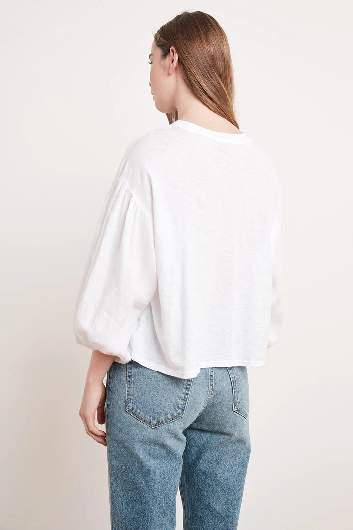 The body is crafted from our signature cotton slub while the puffed sleeves are a summer-weight linen that are cinched with an elastic cuff.