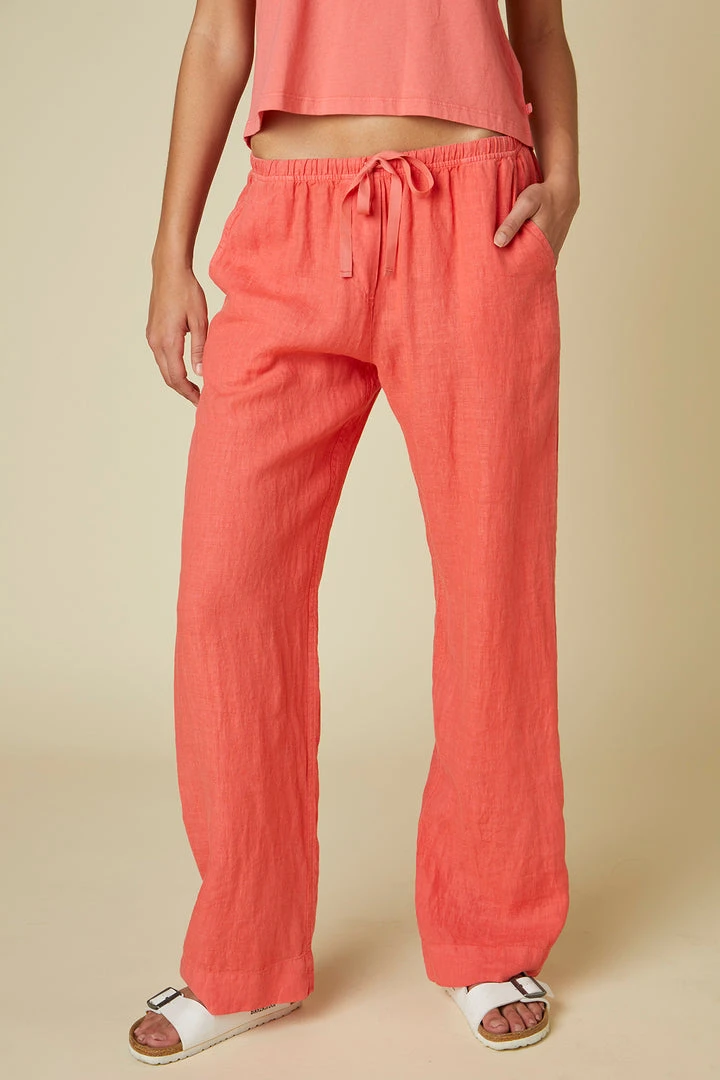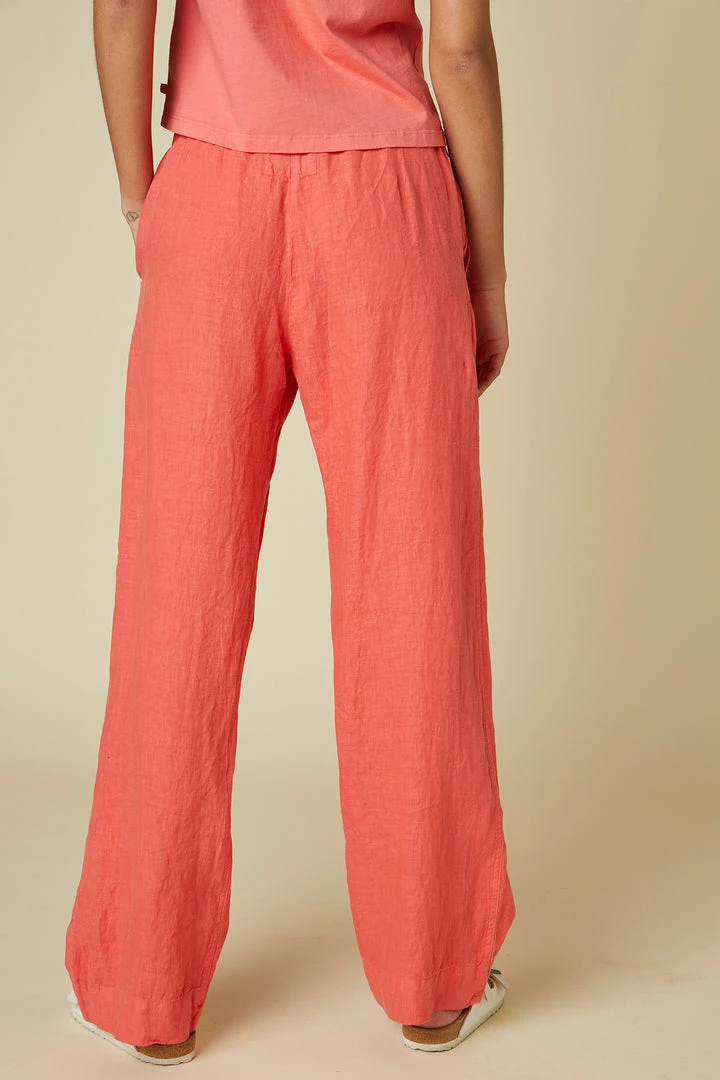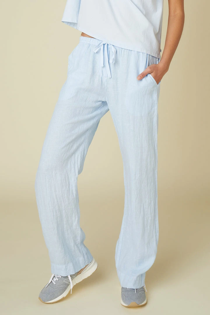 Crafted from a soft linen these easy-on pants feature an elastic waist with a drawstring and medium rise. A relaxed fit to the leg gives a beautiful movement, flow, and infinite versatility.
